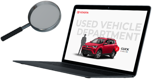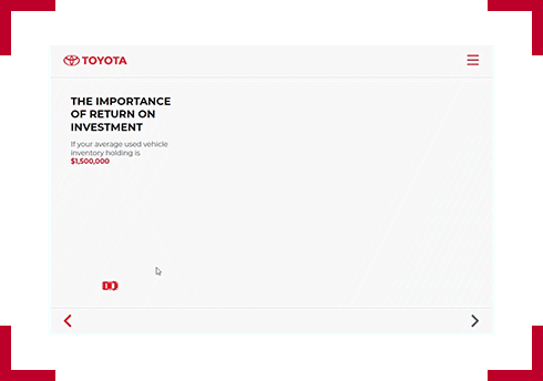 Designer notes:The intro screen of this module is designed in a form of a carousel that cycles through different Toyota vehicles and silhouettes of different types of users. When user selects the arrow key, the car will drive away and transition to the menu screen.