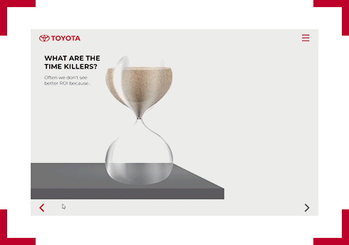 Designer notes: The aim of this interaction is to drag icons representing each time killers and dropping them on the specified area of the hour glass. With each drag and drop, the time capacity of the hour glass will progressively decrease. Once all dot points have been displayed, the hour glass will reach the end of it's time capacity.